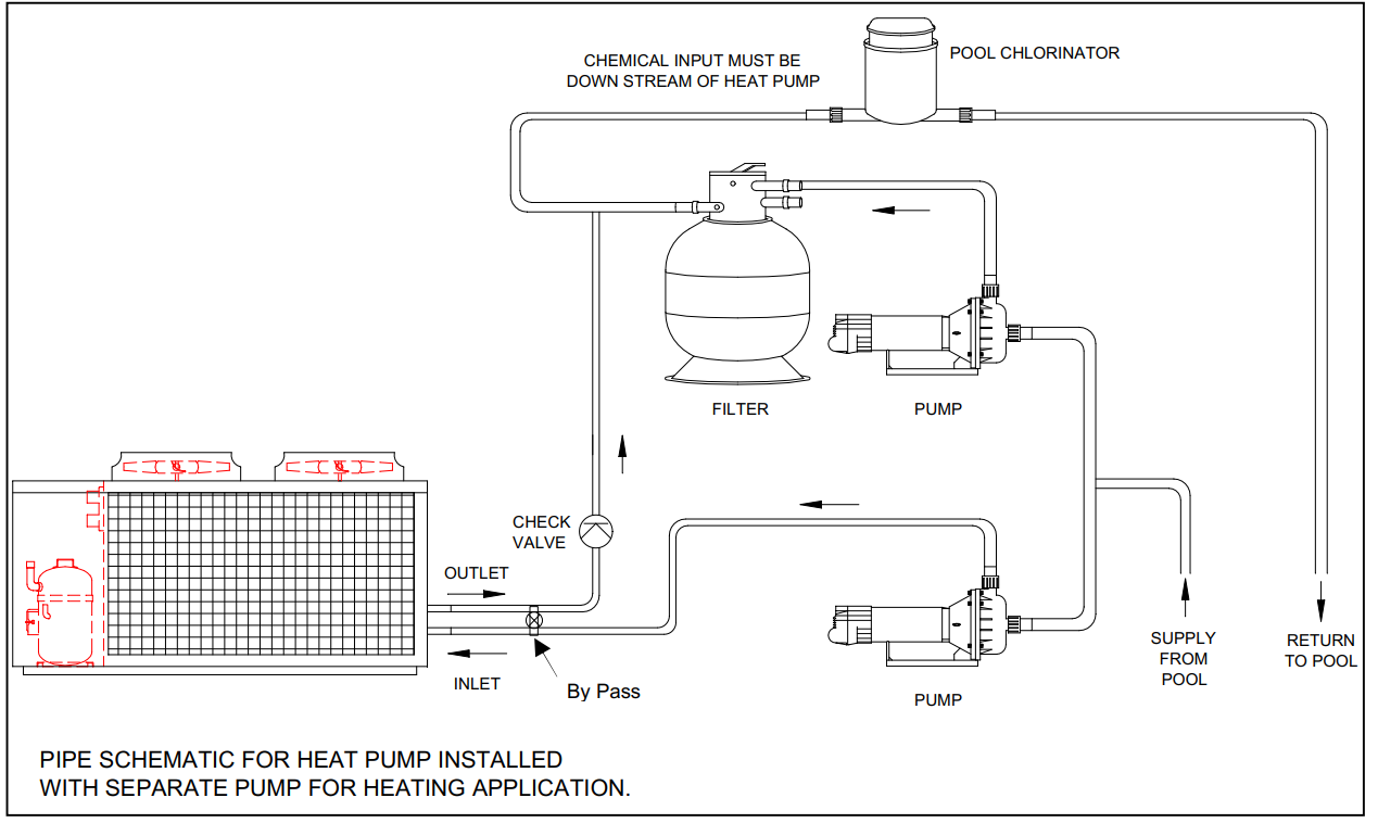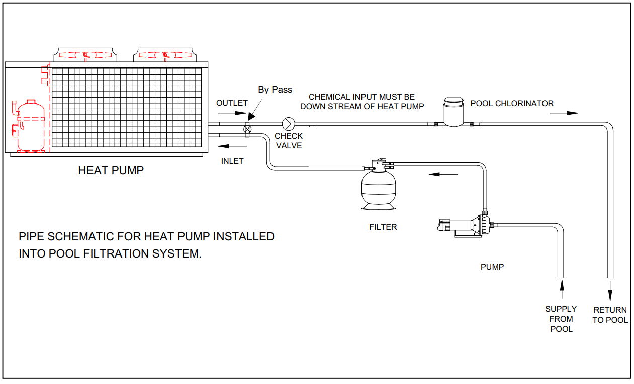 - Nếu lắp đặt bơm nhiệt thẳng hàng với thiết bị lọc hiện có, cần cân nhắc điều chỉnh lưu lượng, thời gian chạy và có thể xảy ra quá trình clo hóa và/hoặc định lượng bằng cách chạy kéo dài máy khử clo tự động, máy cấp liệu, v.v..