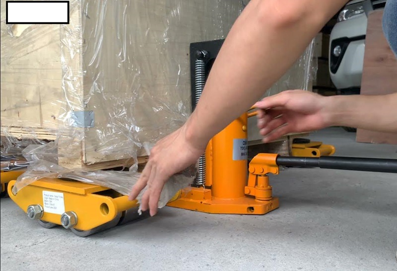 Sau khi con lăn đẩy hàng đã được đặt vào vị trí phù hợp, sử dụng kích thủy lực để từ từ hạ thiết bị xuống. Quá trình hạ cần thực hiện chậm rãi và đều tay, tránh hạ quá nhanh khiến lực tập trung dồn vào một bên, có thể gây lệch hoặc làm hỏng bánh rùa. Bước này cần được thực hiện cẩn thận để đảm bảo thiết bị được đặt ổn định trên bề mặt của các con rùa.