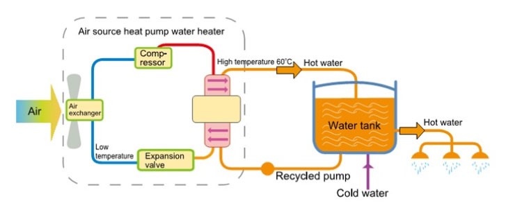 Máy bơm nhiệt bao gồm 4 phần chính: máy sấy, máy nén, máy ngưng tụ, và van giảm áp nối với nhau tạo thành 1 vòng kín. Một luồng chất lưu dễ bay hơi, gọi là lưu chất vận động luân chuyển trong máy bơm với nhiệm vụ vận chuyển nhiệt lượng lấy từ môi trường ngoài cung cấp cho môi trường tiếp nhận.