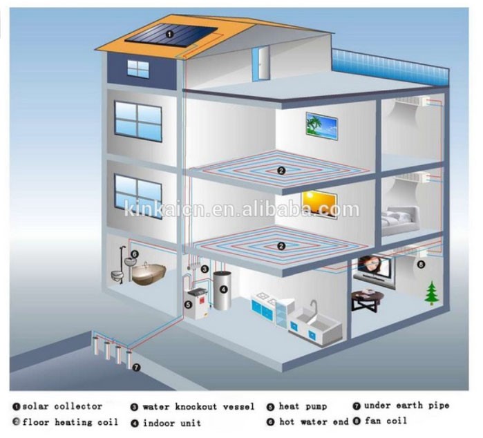 Mỗi ngày ánh nắng mặt trời truyền năng lượng xuống Trái Đất, được đất hấp thụ và lưu trữ lại một lượng đáng kể, máy bơm nhiệt sử dụng nguồn năng lượng này được gọi là máy bơm địa nhiệt, có ưu điểm là tận dụng được nguồn năng lượng tự nhiên có sẵn trong lòng đất của mỗi công trình, không chịu ảnh hưởng tới nhiệt độ môi trường xung quanh, do nhiệt độ trong lòng đất luôn ổn định, tuy nhiên chi phí lắp đặt thì lại khá cao. Khi lắp đặt máy bơm địa nhiệt, có hai cách bố trí hệ thống thu dẫn nhiệt là: theo chiều ngang ( đặt sâu khoảng 0,6-1,2 mét so với mặt đất, và chiếm một diện tích lớn, thường được đặt sâu trong sân vườn nhà, và theo chiều dọc ( không yêu cầu nơi lắp đặt phải có sân vườn nhưng đào sâu từ 80-120m )