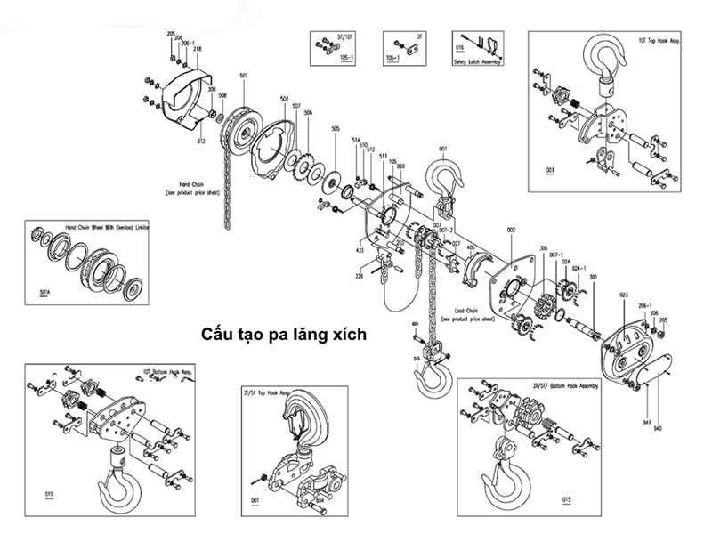 Móc treo: Được làm từ thép hợp kim đã qua xử lý nhiệt nên độ bền và độ chắc chắn cao. Móc có thể quay vòng 360 độ. Khi hoạt động quá tải, móc không đứt gãy ngay mà giãn ra từ từ, hơn nữa móc còn được trang bị khóa an toàn đảm bảo dây móc không bị rơi ra ngoài, an toàn cho người sử dụng.