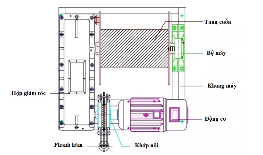 Cấu tạo của một máy tời điện đóng vai trò quan trọng trong việc thực hiện quá trình nâng hạ và di chuyển vật liệu. Máy tời điện bao gồm các thành phần cơ bản sau: